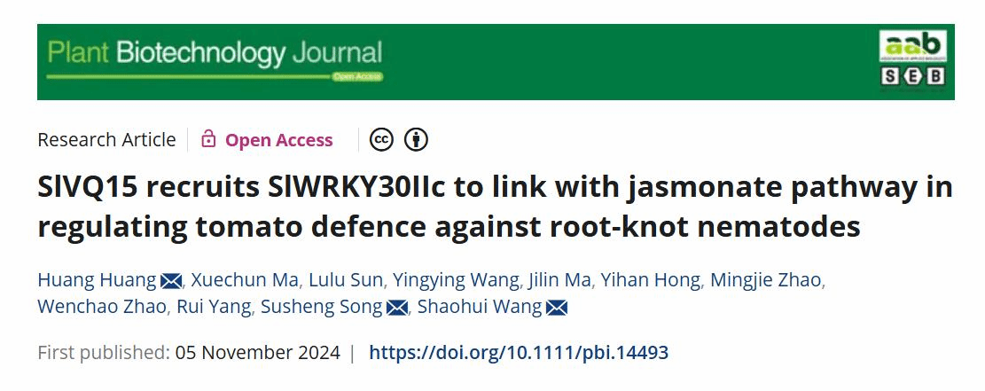 近日,yl23411永利集团王绍辉/赵文超教授团队、首都师范大学宋素胜教授团队在Plant Biotechnology Journal发表了题为“SlVQ15 recruits SlWRKY30IIc to link with jasmonate pathway in regulating tomato defence against root-knot nematodes”的研究论文。该论文揭示了SlVQ15招募转录因子SlWRKY30IIc,偶联茉莉素途径调控番茄应对根结线虫入侵的分子机制,为茄科植物的抗性育种提供新的思路。