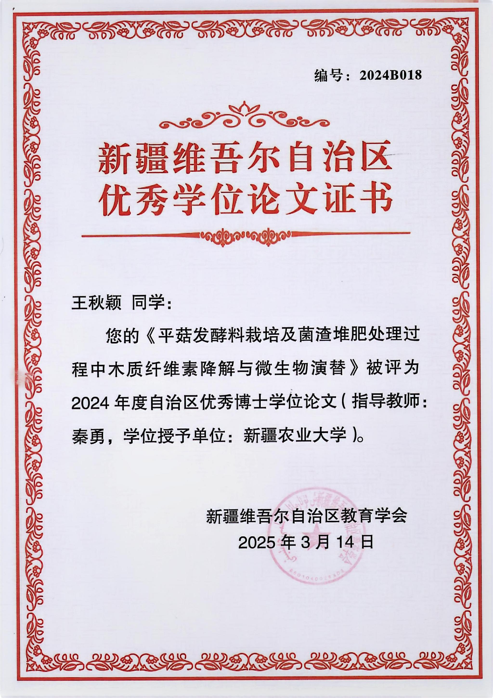 近日,新疆维吾尔自治区教育厅公布2024年优秀学位论文评选结果,yl23411永利集团永利23411集团2024届联合培养博士王秋颖的学位论文《平菇发酵料栽培及菌渣堆肥过程中木质纤维素降解与微生物群落演替》成功入选。该论文由yl23411永利集团张国庆教授与新疆农业大学秦勇教授联合指导完成。