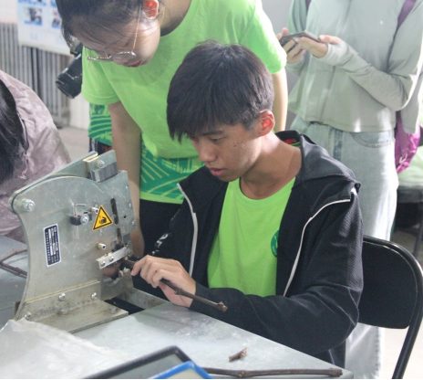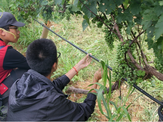 随后陈经理带领大家来到育苗室,详细为大家介绍葡萄育苗标准操作流程——嫁接、愈伤、栽培、种植流程。同时学生们亲自体验使用嫁接机进行接穗。