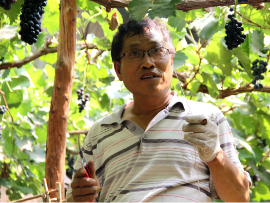 随后,实践团来到了当地的振兴合作社,参观了当地的设施葡萄种植基地。经该合作社高级工程师李经理的讲授,该地将“夏黑”葡萄品种重点培育,采用极短式枝条修剪技术及嫁接苗的方式,保证了该品种较高的结果率及葡萄甜度,且大棚中采用防虫网,避免了虫害的干扰,使得葡萄果实质量大大提高。由于当地干旱的气候条件,故当地村民采用了洼地的建棚模式,使大棚水平面低于地面水平面,将雨水的利用率提高,从而提高该地葡萄产量及质量。张卿老师、王志忠老师对于葡萄的种植、嫁接、修剪等技术进行了现场教学。