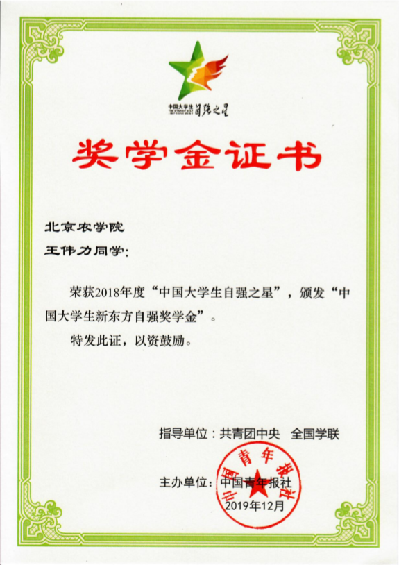 永利23411集团王伟力同学荣获“中国大学生自强之星”称号