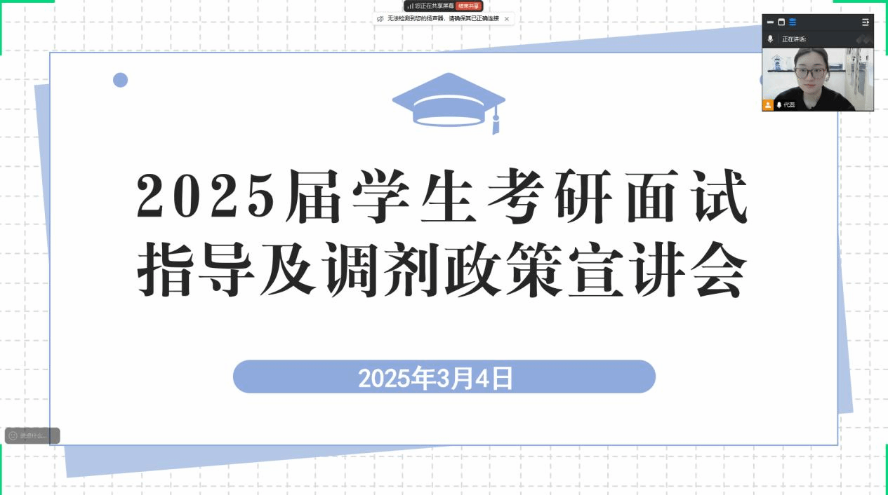 为帮助2025届考研学生顺利考取心仪院校,3月4日,永利23411集团在线上举办考研面试指导及调剂政策宣讲会,为学生提供指导与帮助。会议由辅导员代蕊主持,学院党委副书记、永利集团副院长赵文超,研究生秘书贾慧敏参加会议。