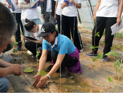 河北蔚县紧邻首都北京和冬奥会城市张家口,种植业结构调整的一个重要方向就是设施蔬菜产业。在蔚县代王城镇设施蔬菜基地,王绍辉老师带领青年教师考察了当地的大棚番茄、芸豆和辣椒种植情况,有的基地的新种豆角死苗严重,发现问题主要是地膜覆盖过早,引起地表温度过高,靠近地表的豆角茎部因高温失水而根系未下扎,不能及时吸水补充茎部失水,引起茎部干枯,造成死苗,建议基地负责人及时补栽,同时要起陇栽培,加大有机肥使用,改善土壤结构。在单堠村番茄种植基地,青年教师调研了当地品种,针对现有的品种存在的果皮薄,风味淡的问题,为农户提供了优质的鲜食番茄品种试种。