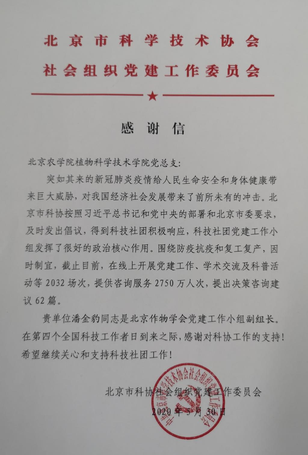 来自中共北京市科学技术协会社会组织党建工作委员会的感谢信