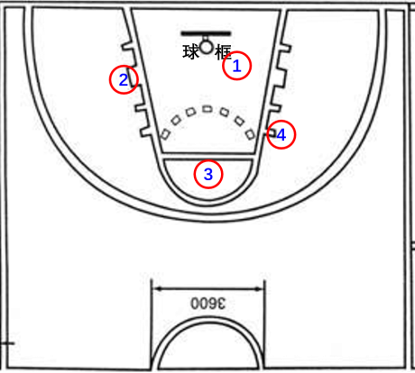 组内队员各自站好位置(见下图)后开始计时。按站位顺序依次投篮1次,统计1分钟内投篮进球个数。比赛过程中自行捡球。