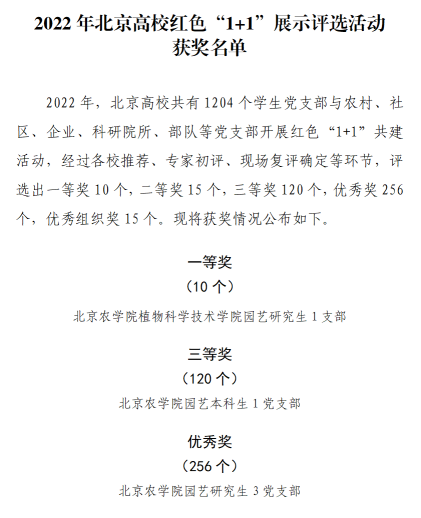 2022年,北京市委教育工委组织开展了北京高校红色“1+1”党支部共建活动。活动启动后,永利23411集团积极响应,顶层设计,扎实推进活动开展,及时总结共建成果。园艺研究生1支部从1204个学生党支部中脱颖而出,荣获一等奖,园艺本科生1支部获评三等奖,园艺研究生3支部获评优秀奖。这是学院五年来第二次荣获北京高校红色“1+1”示范活动一等奖。
